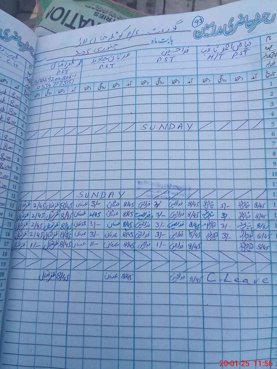 | CNIC | Full Name | Designation | R/C | Absence During Last Calender Month |
