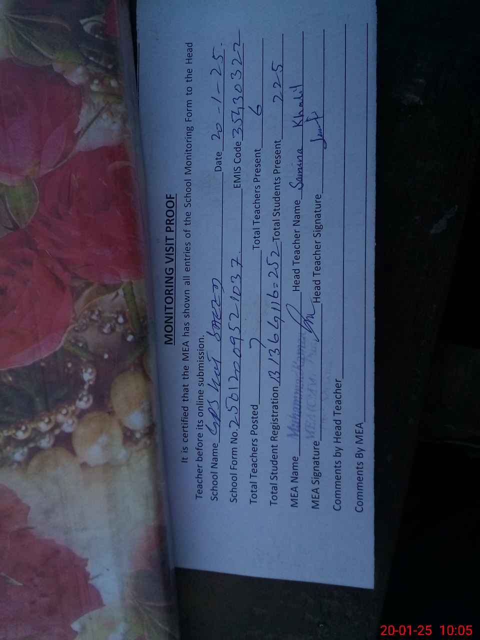 | Attendance Register | Head Teacher | MEA with School | Visit Proof |