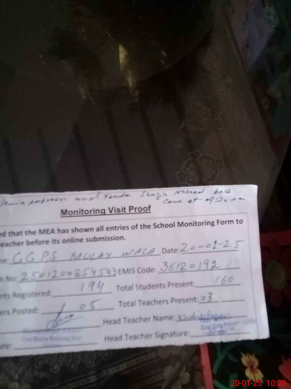 | Attendance Register | Head Teacher | MEA with School | Visit Proof |