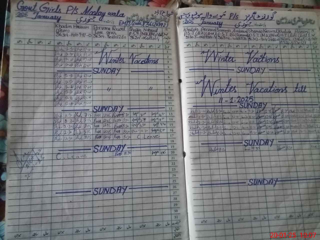 | Remarks (Use Separate Page if Required): Teacher Samia Ambreen and Teacher Shazia Naheed Came to school at 0930am After 40 minutes marked absent | |||||
