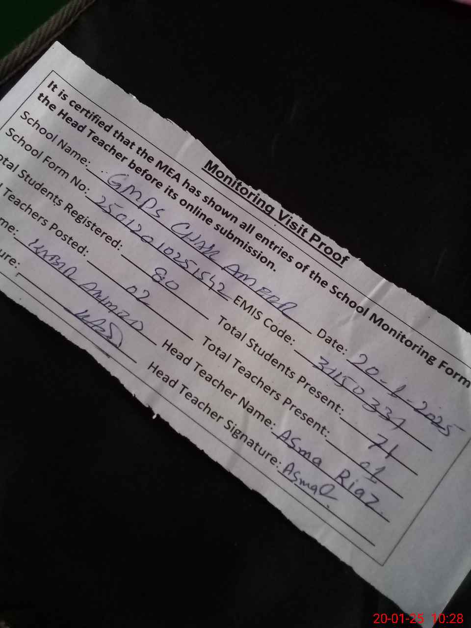 | Attendance Register | Head Teacher | MEA with School | Visit Proof |
