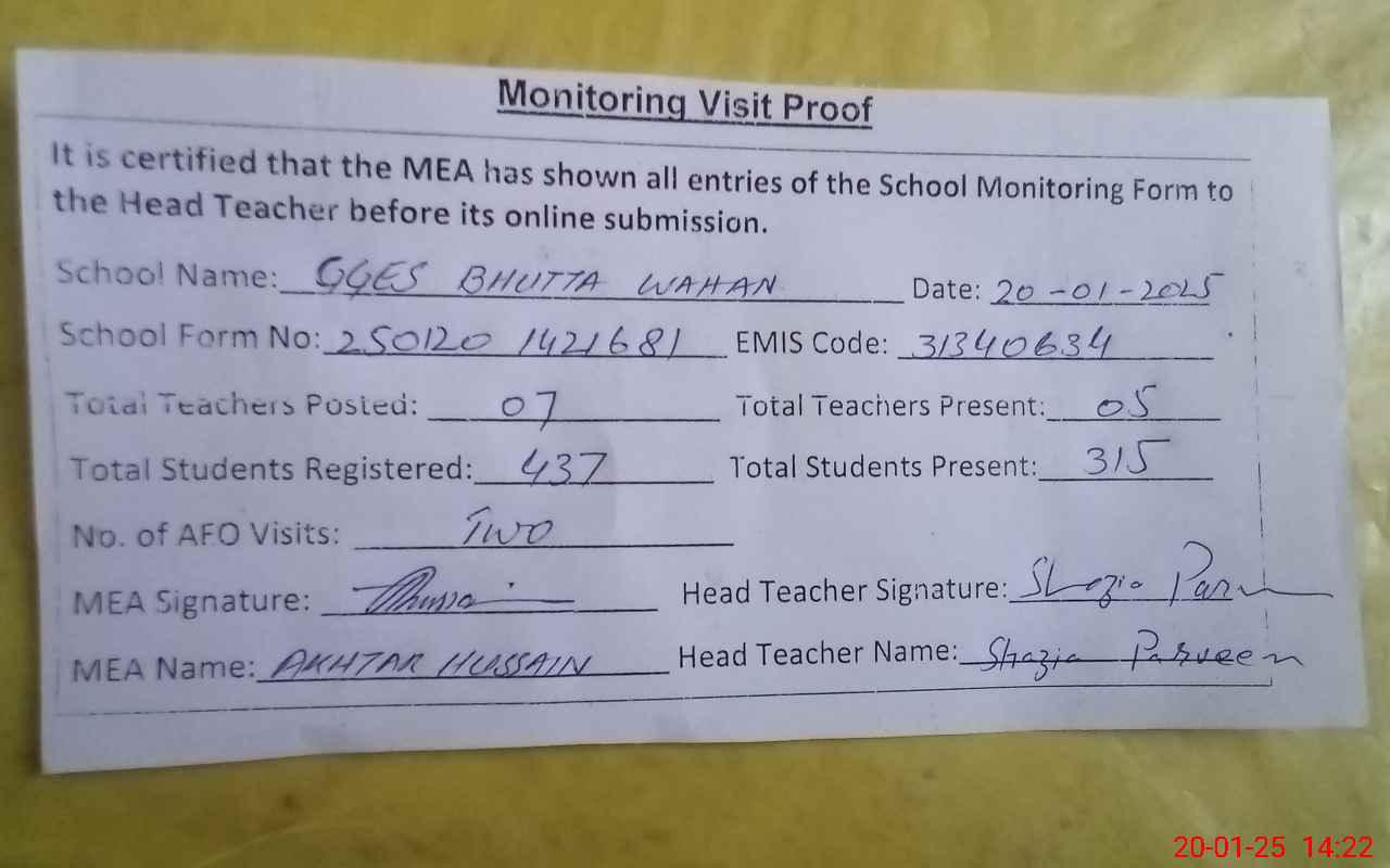 | EMIS Code: 31340634 | Name of School: GGES BHUTTA WAHAN | |||