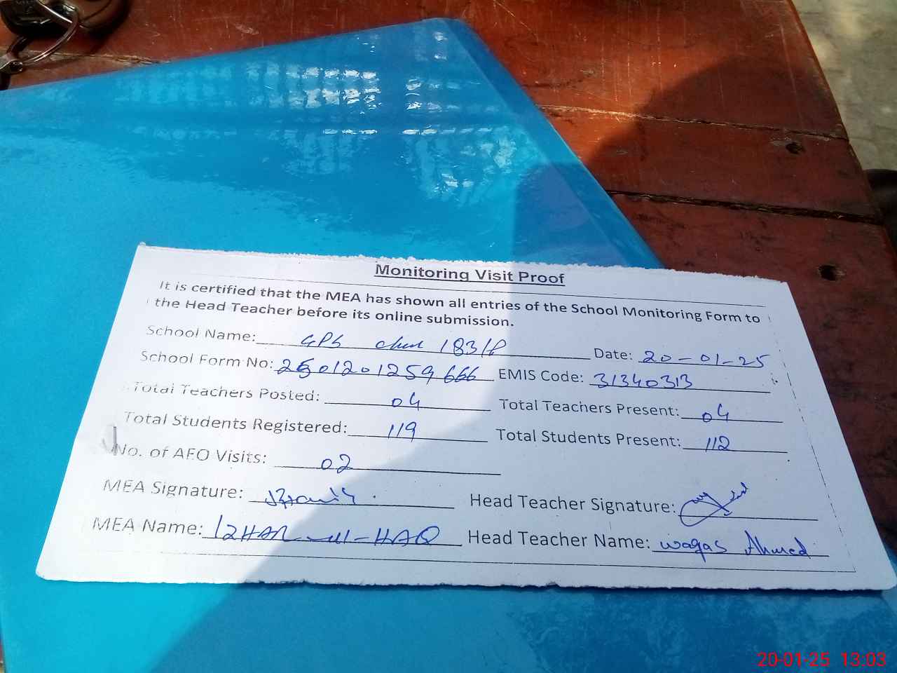 | Attendance Register | Head Teacher | MEA with School | Visit Proof |