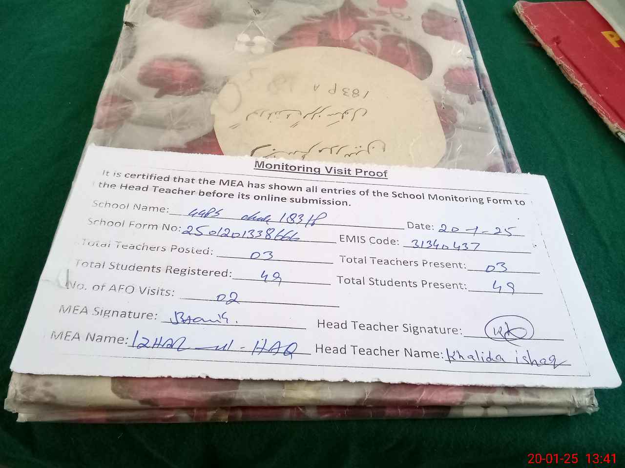 | Attendance Register | Head Teacher | MEA with School | Visit Proof |