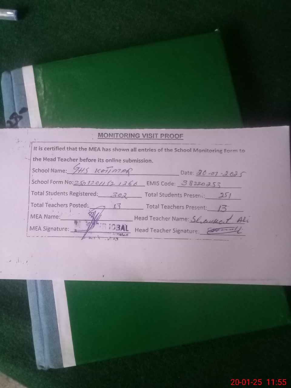 | Attendance Register | Head Teacher | MEA with School | Visit Proof |