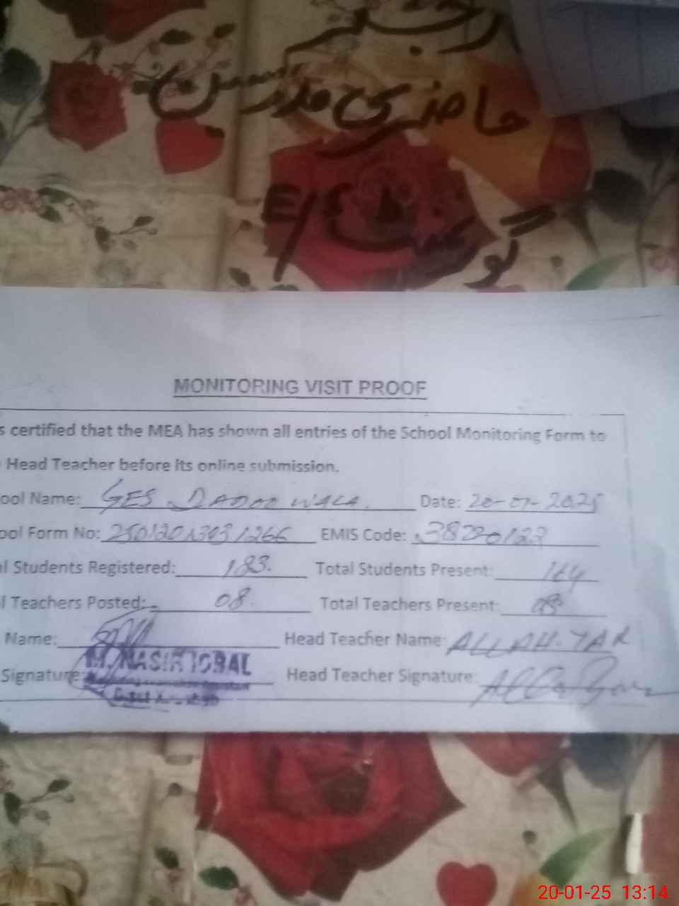 | Attendance Register | Head Teacher | MEA with School | Visit Proof |