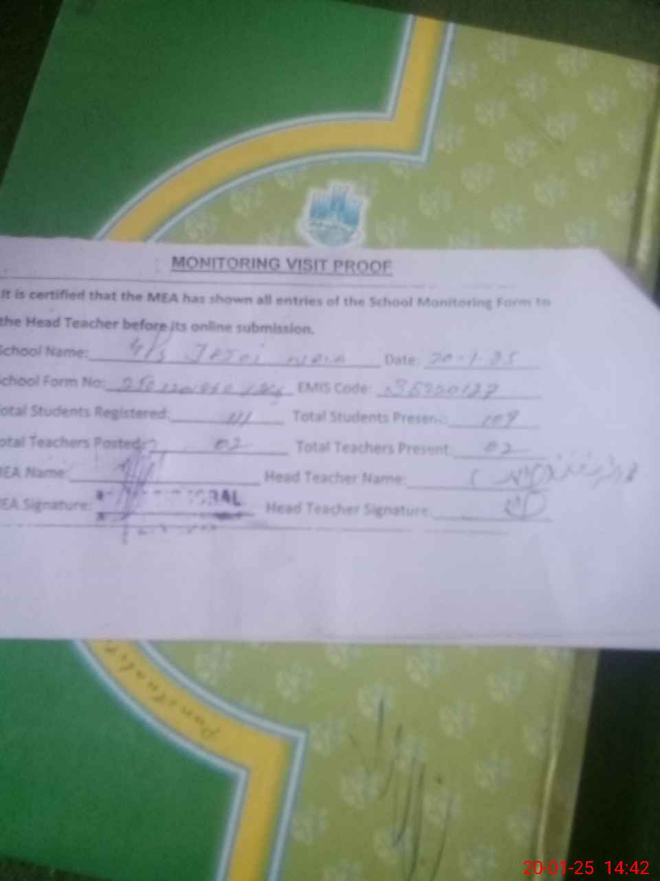 | Attendance Register | Head Teacher | MEA with School | Visit Proof |