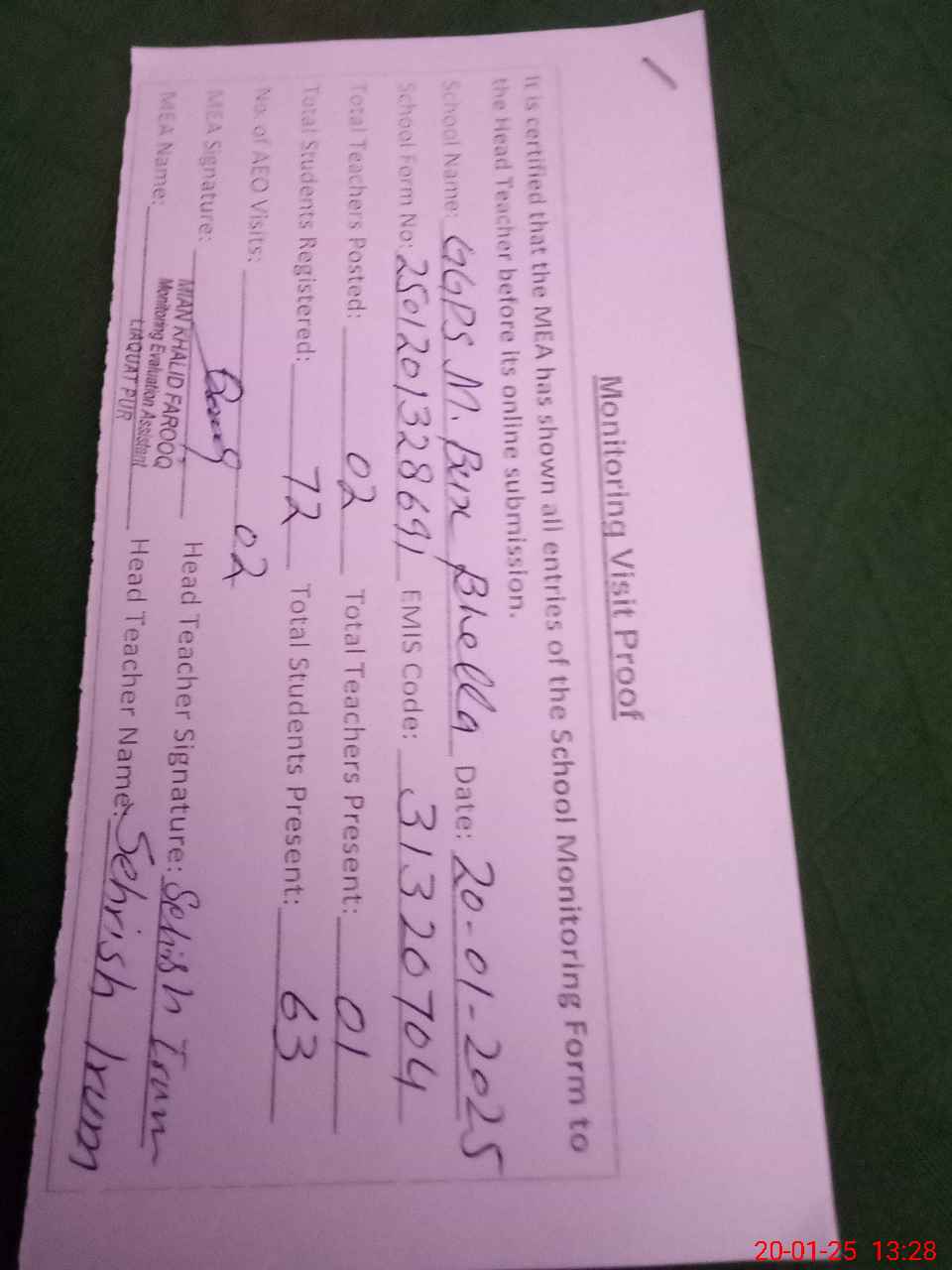 | Attendance Register | Head Teacher | MEA with School | Visit Proof |