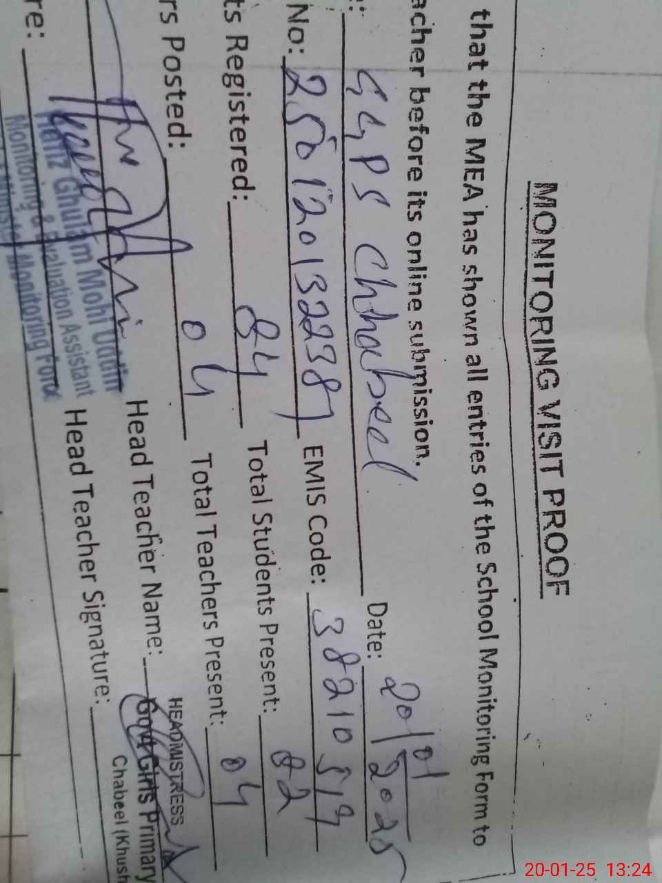 | Attendance Register | Head Teacher | MEA with School | Visit Proof |