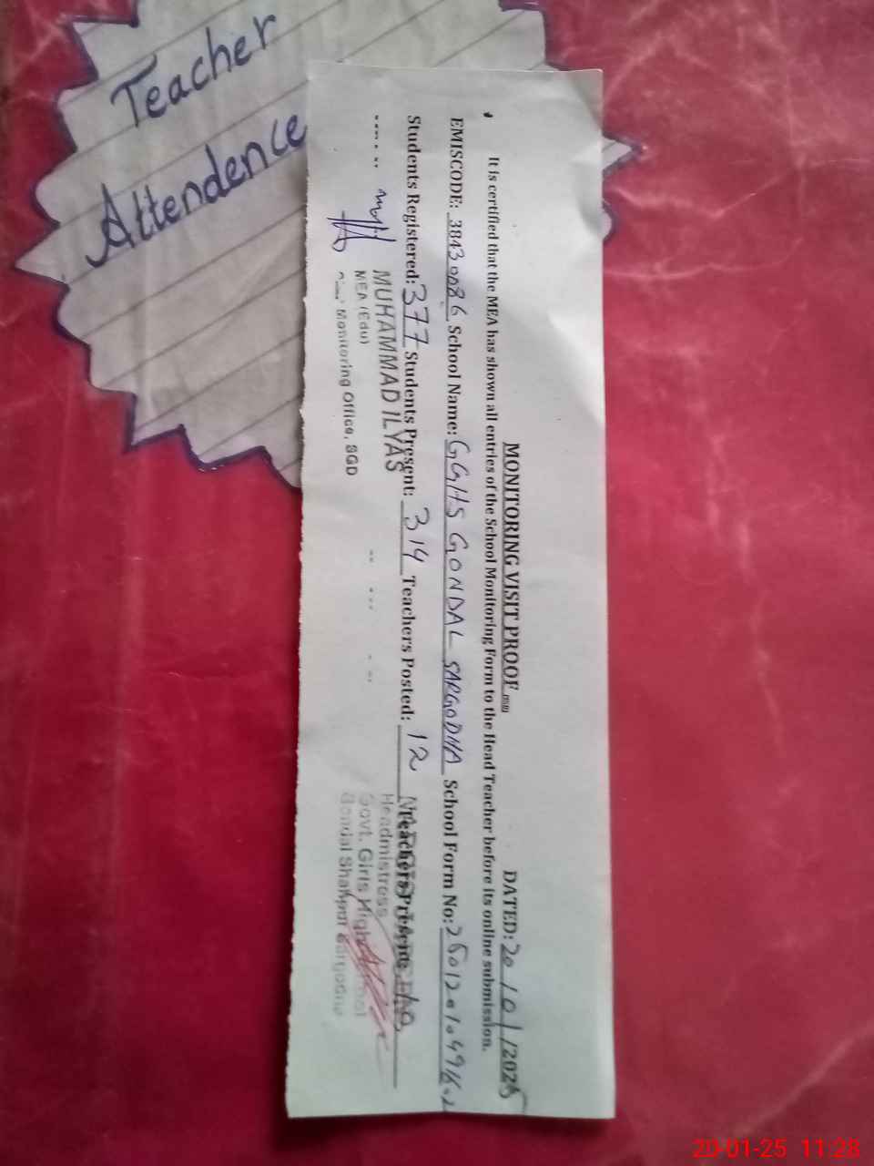 | Attendance Register | Head Teacher | MEA with School | Visit Proof |