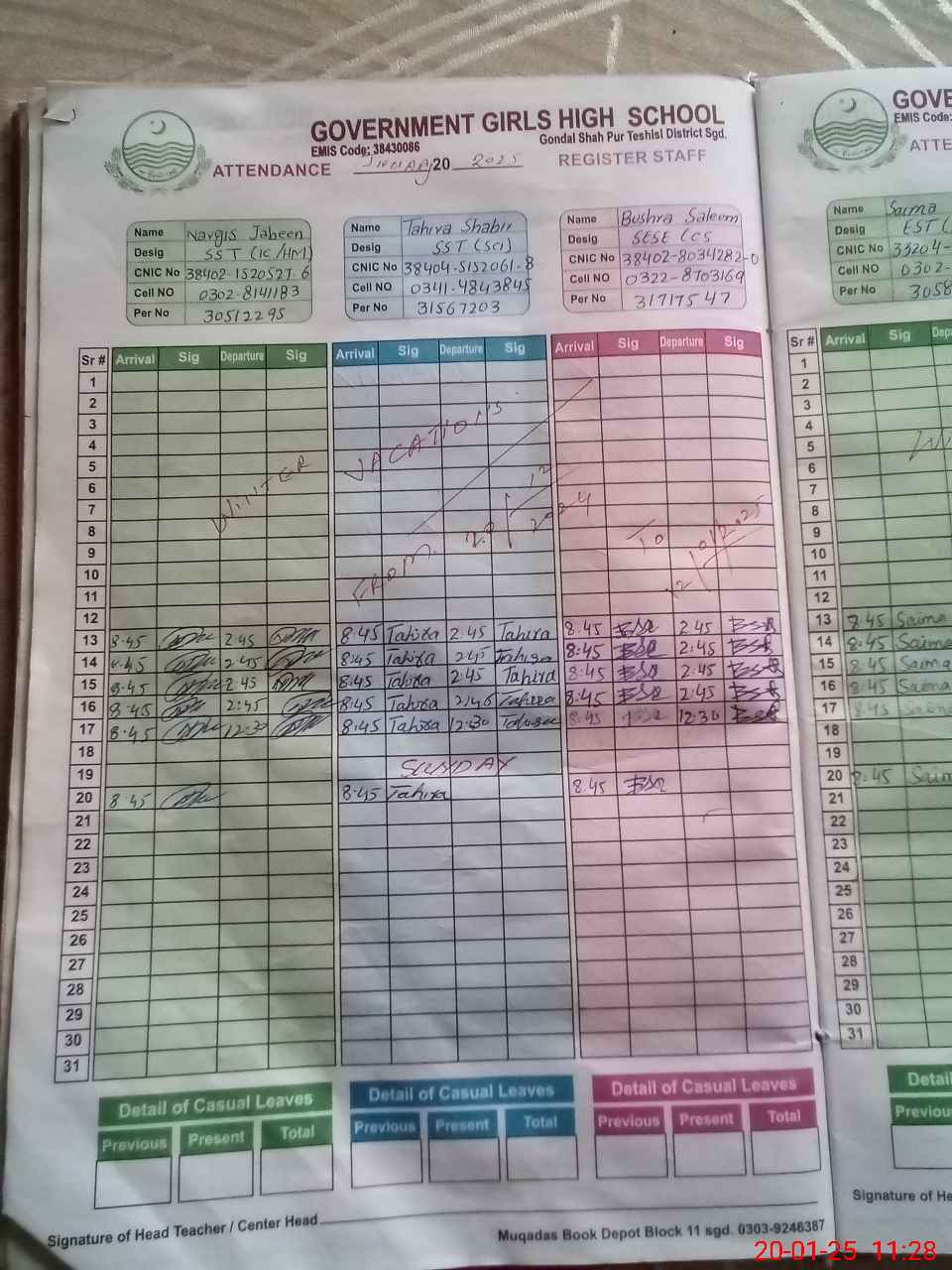 | CNIC | Full Name | Designation | R/C | Absence During Last Calender Month |