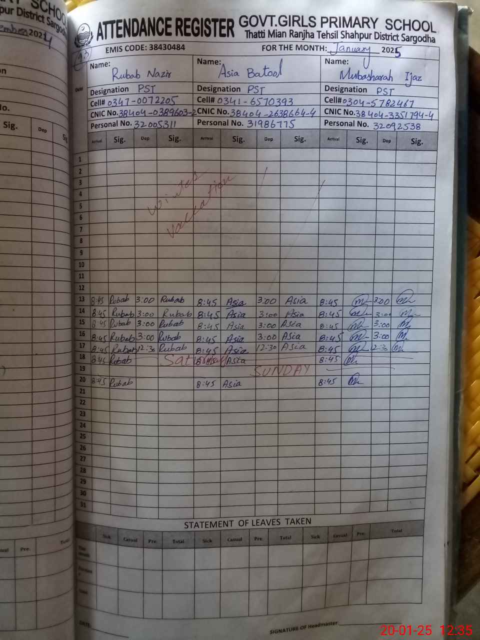 | Name: RU**** NA**** Designation: (School Headmaster's/Headmistress's) PST (SCI-MATH) Phone/Cell Number: 03**** |