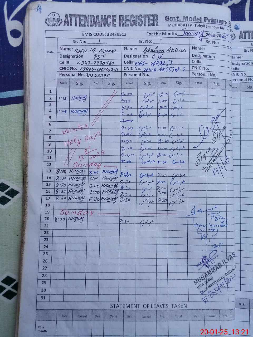 | CNIC | Full Name | Designation | R/C | Absence during last cal. month |
