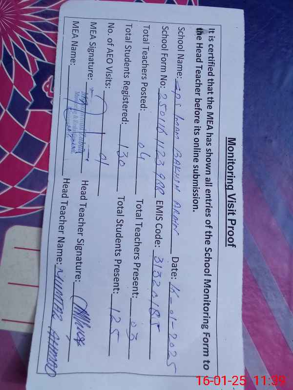 | Attendance Register | Head Teacher | MEA with School | Visit Proof |