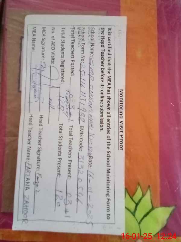 | Attendance Register | Head Teacher | MEA with School | Visit Proof |