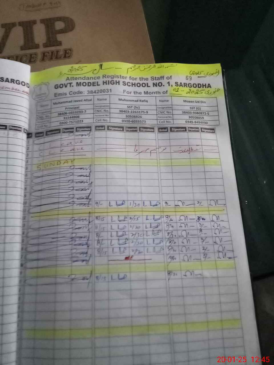 | CNIC | Full Name | Designation | R/C | Absence during last cal. month |
