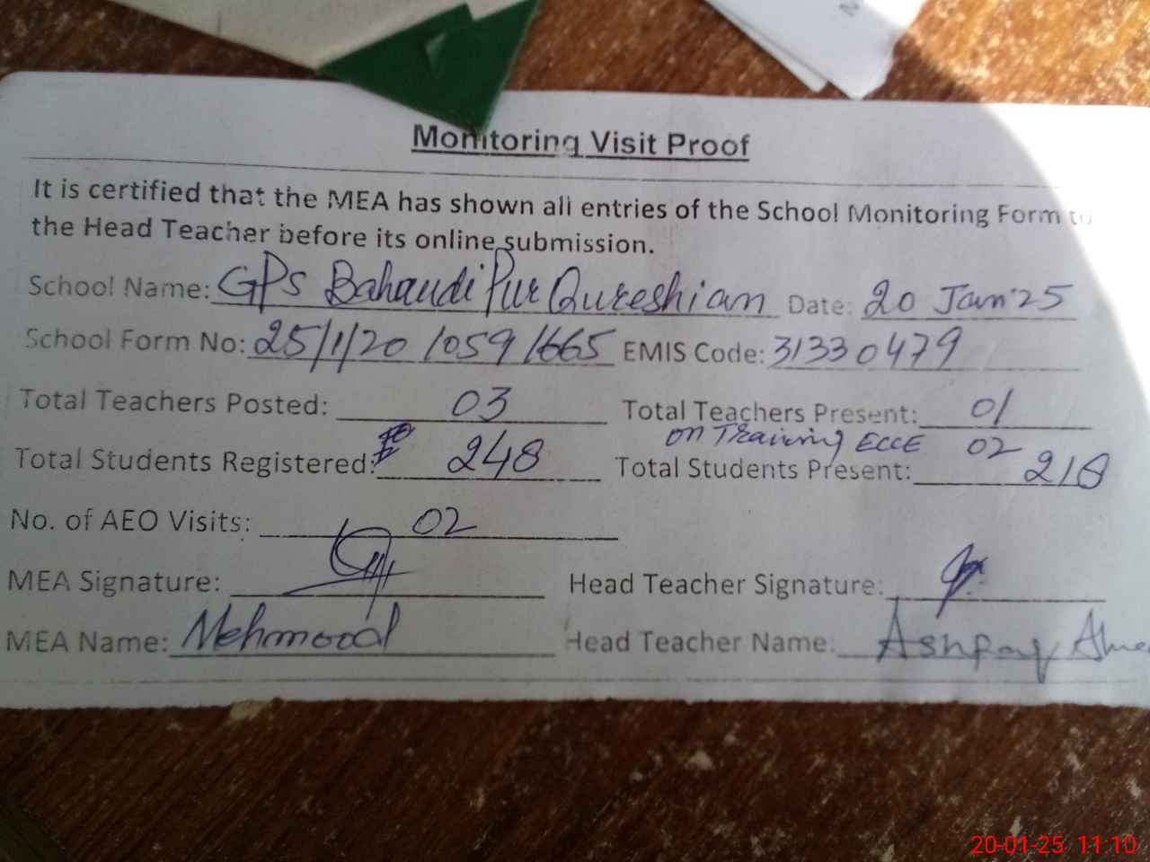 | Attendance Register | Head Teacher | MEA with School | Visit Proof |