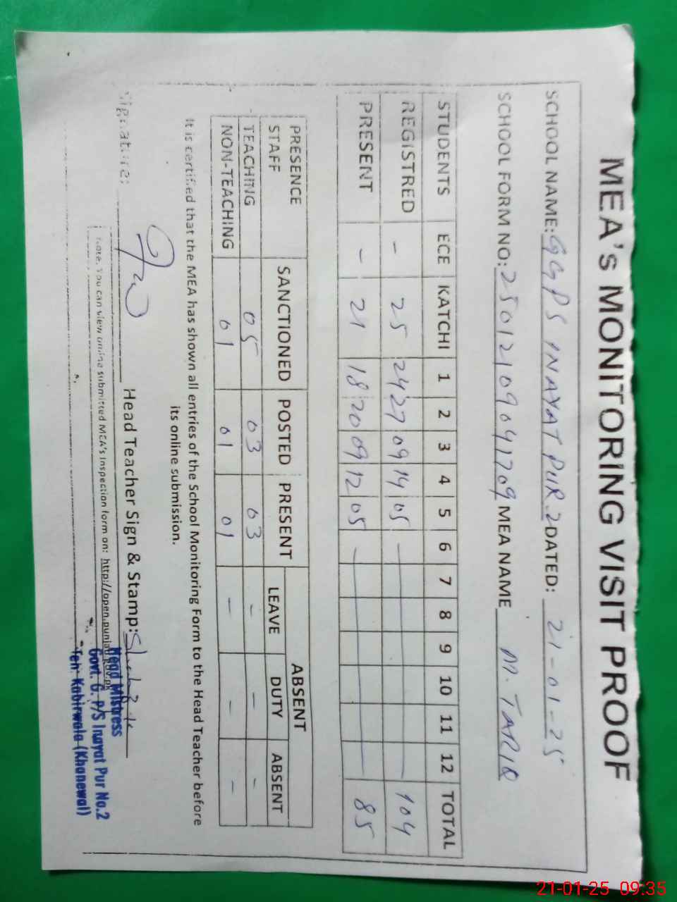 | Attendance Register | Head Teacher | MEA with School | Visit Proof |