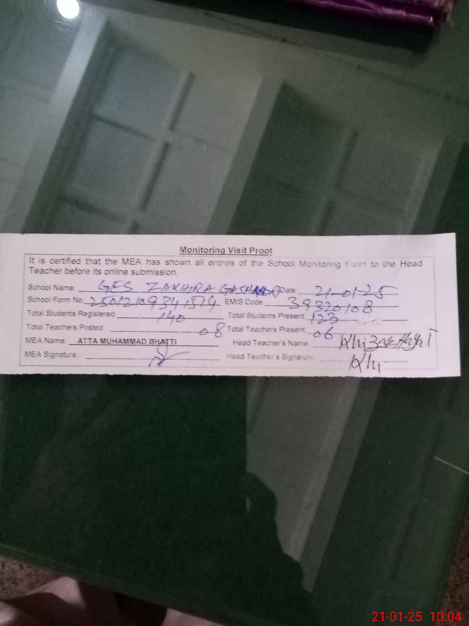 | Attendance Register | Head Teacher | MEA with School | Visit Proof |