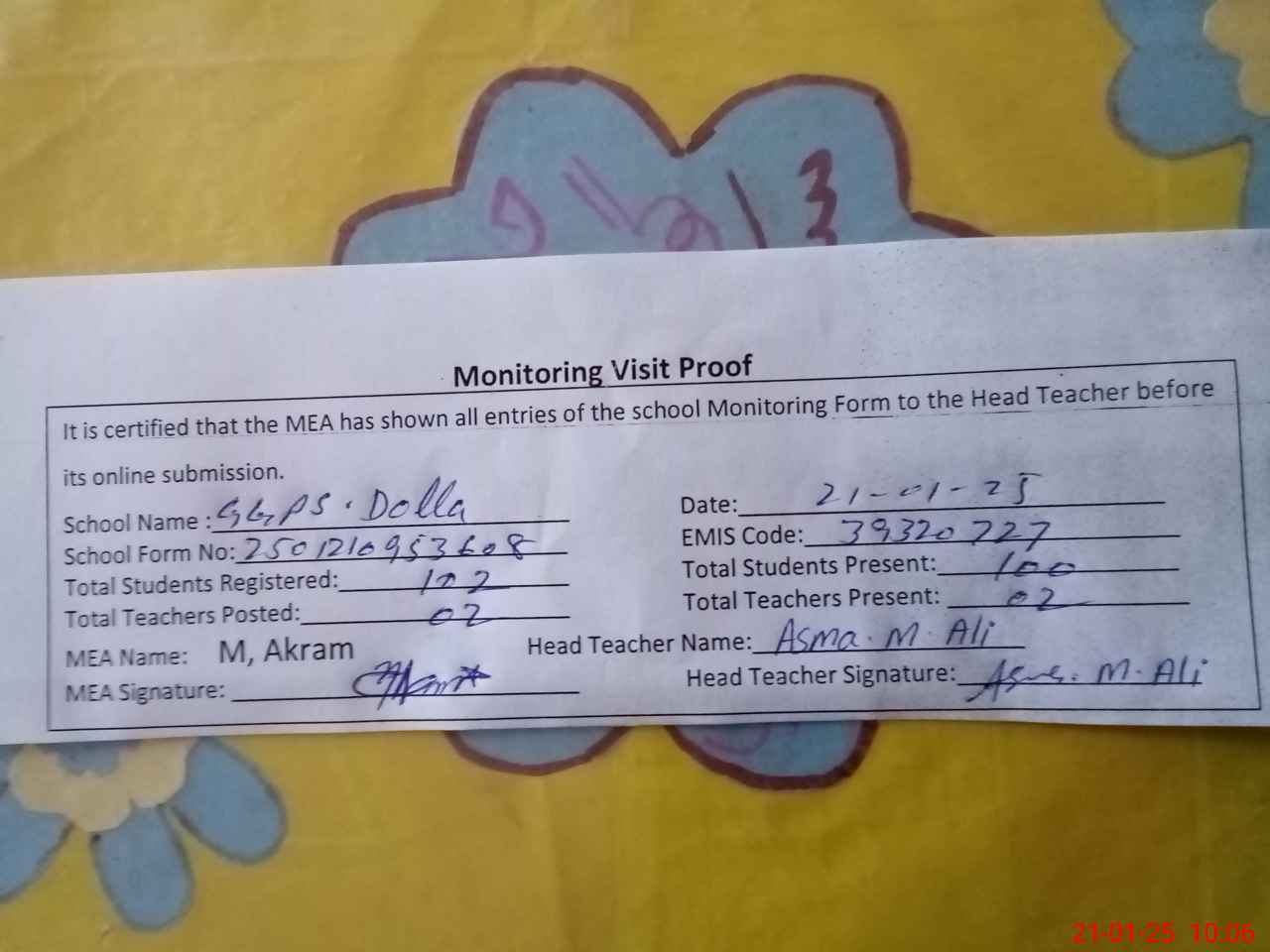 | Attendance Register | Head Teacher | MEA with School | Visit Proof |