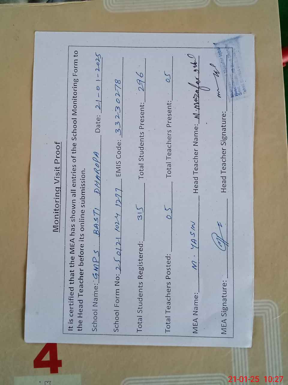 | Attendance Register | Head Teacher | MEA with School | Visit Proof |