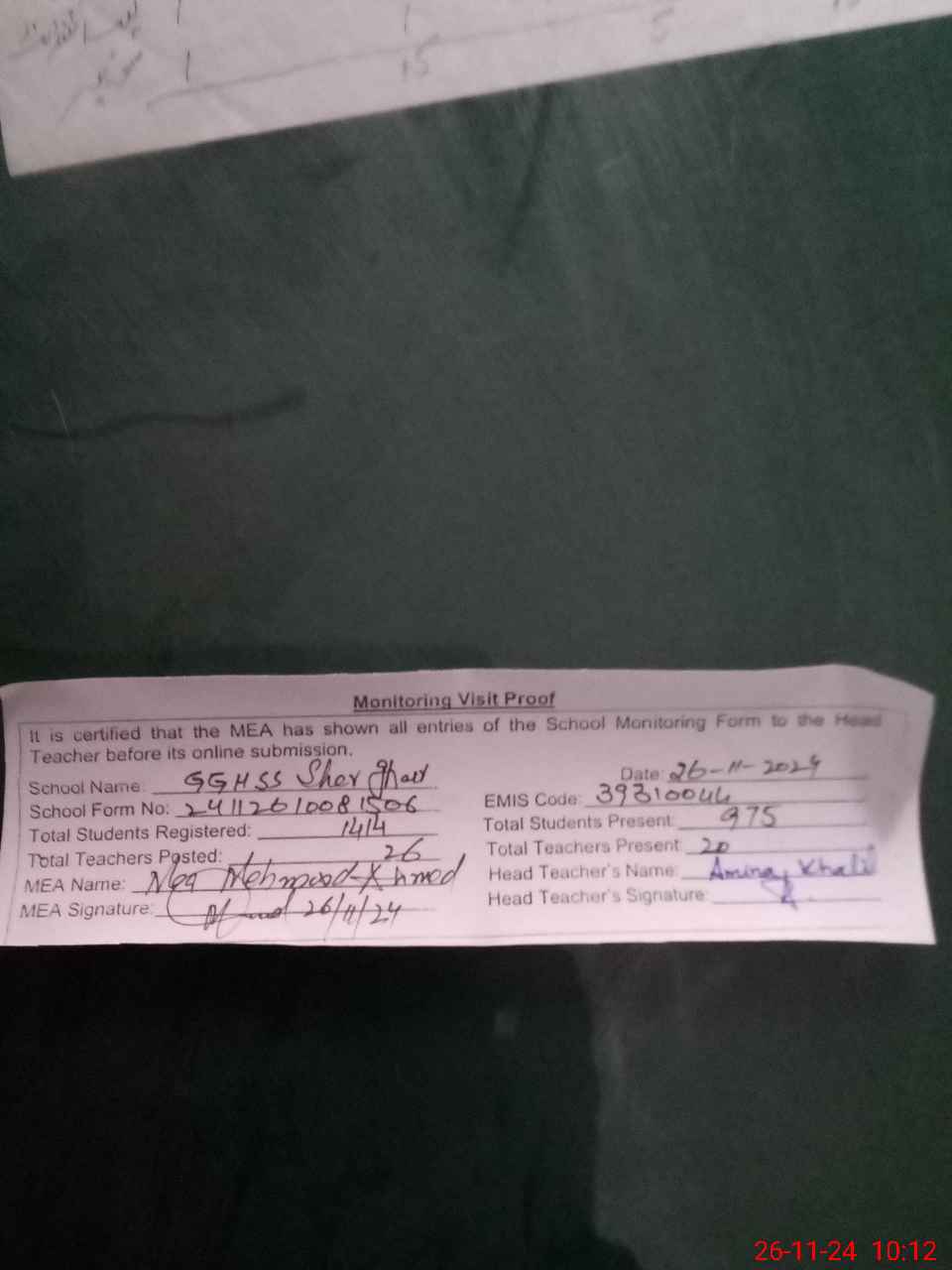 | Attendance Register | Head Teacher | MEA with School | Visit Proof |
