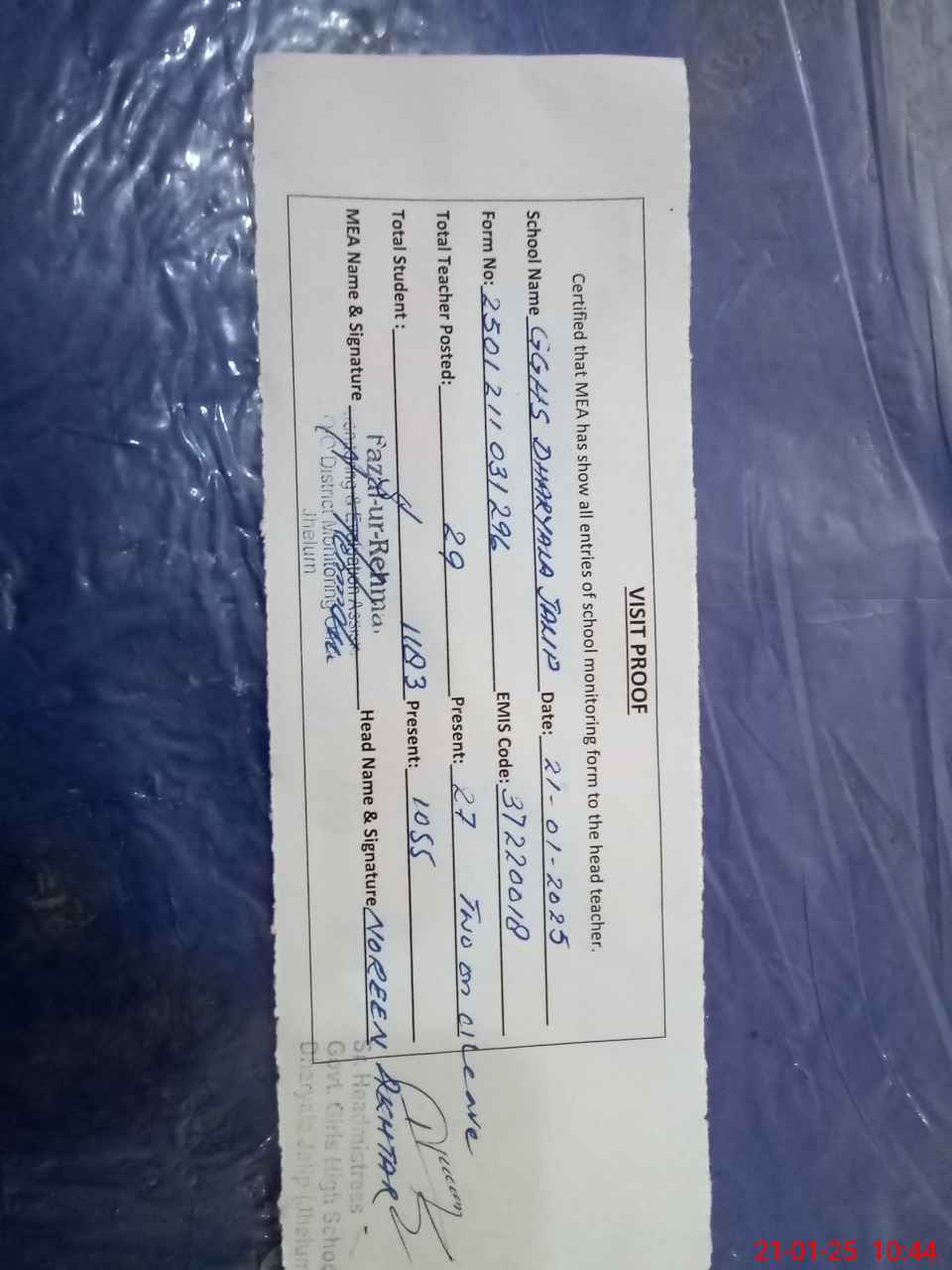 | Attendance Register | Head Teacher | MEA with School | Visit Proof |