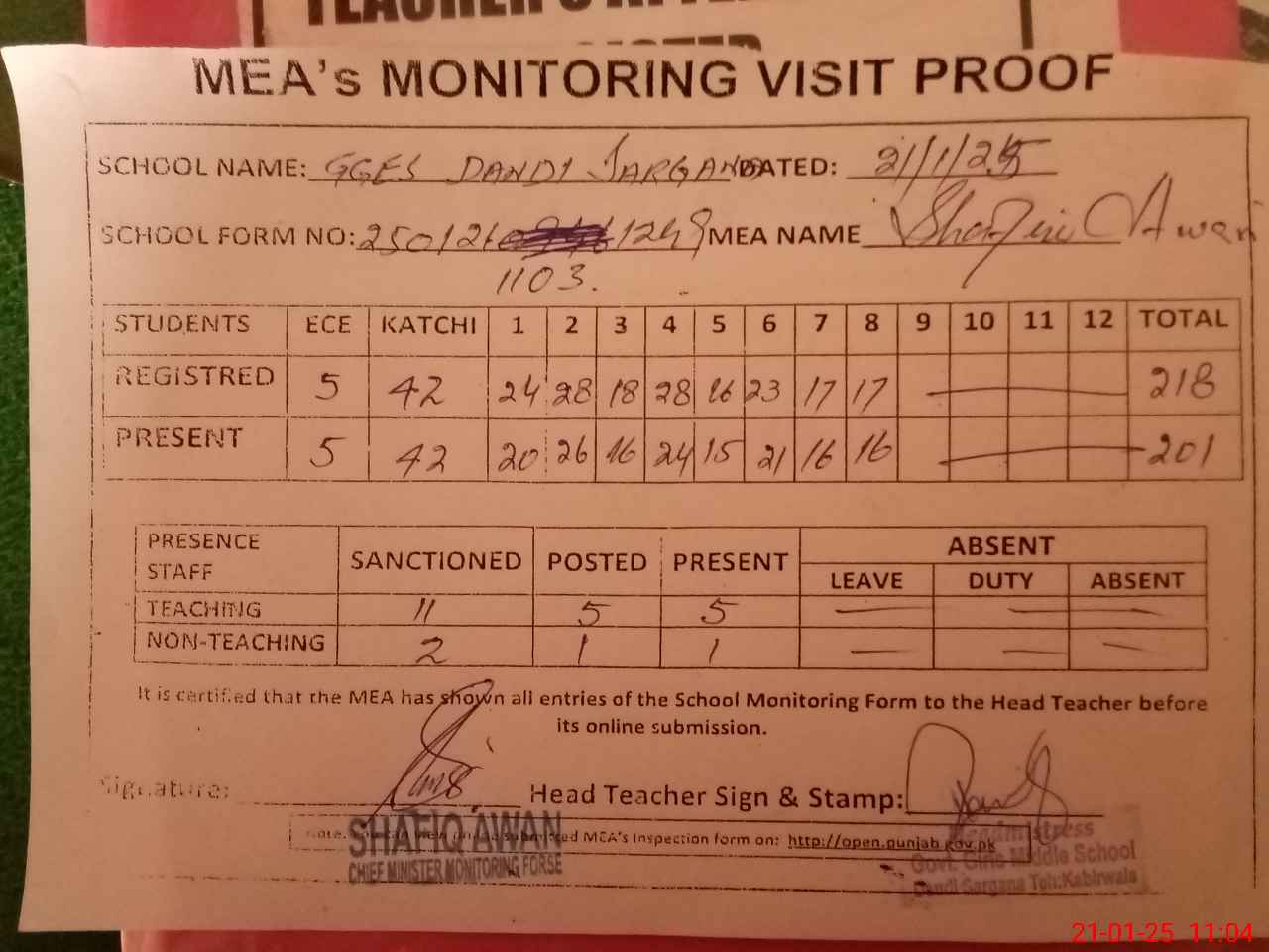 | Attendance Register | Head Teacher | MEA with School | Visit Proof |
