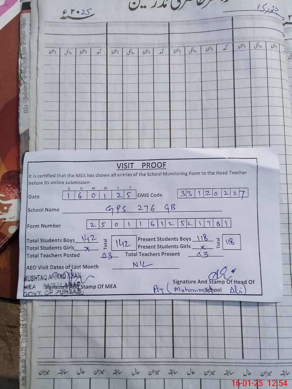 | Attendance Register | Head Teacher | MEA with School | Visit Proof |