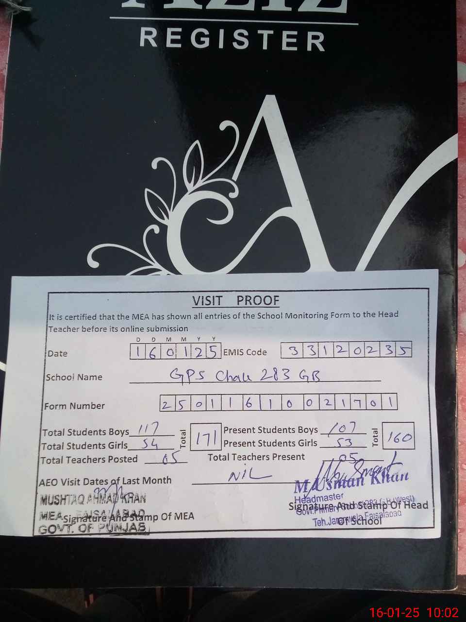 | Attendance Register | Head Teacher | MEA with School | Visit Proof |
