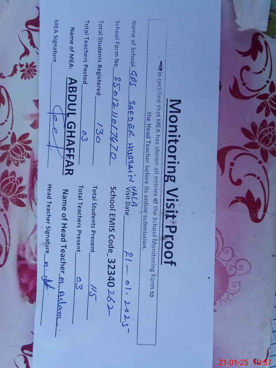 | EMIS Code: 32340262 | Name of School: GPS SAFDER HUSSAIN WALA | |||
