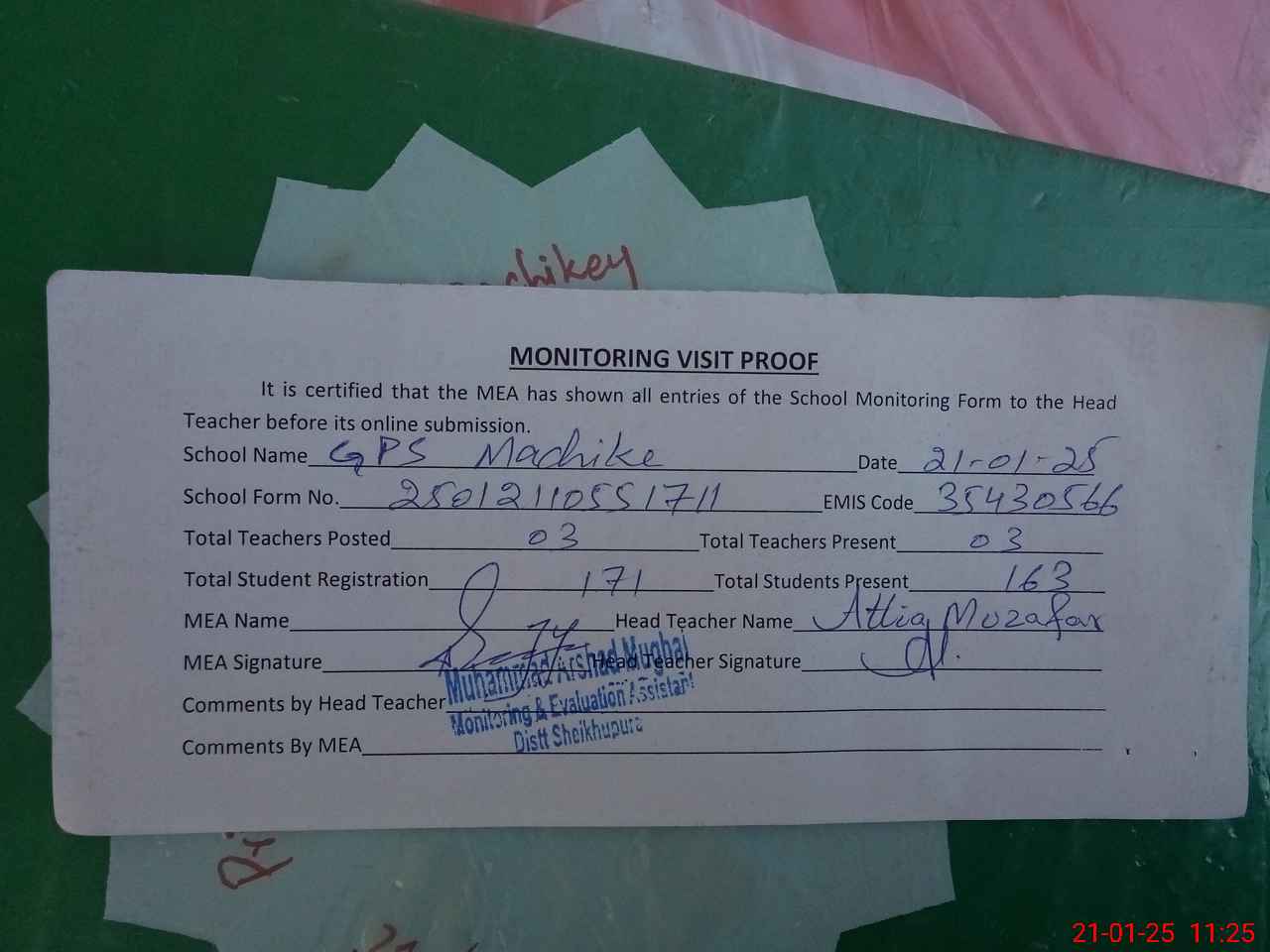 | Attendance Register | Head Teacher | MEA with School | Visit Proof |