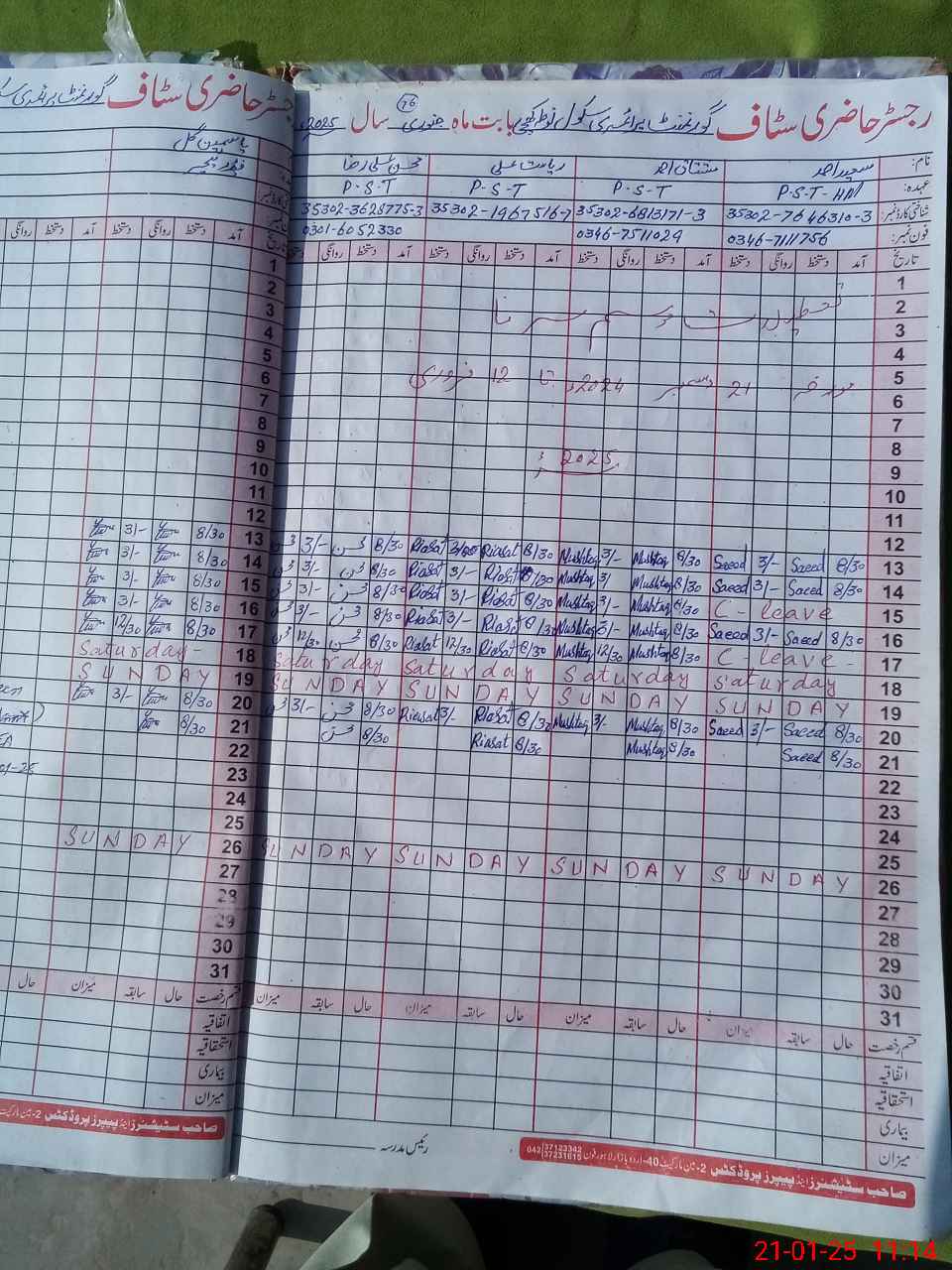 | CNIC | Full Name | Designation | R/C | Absence During Last Calender Month |