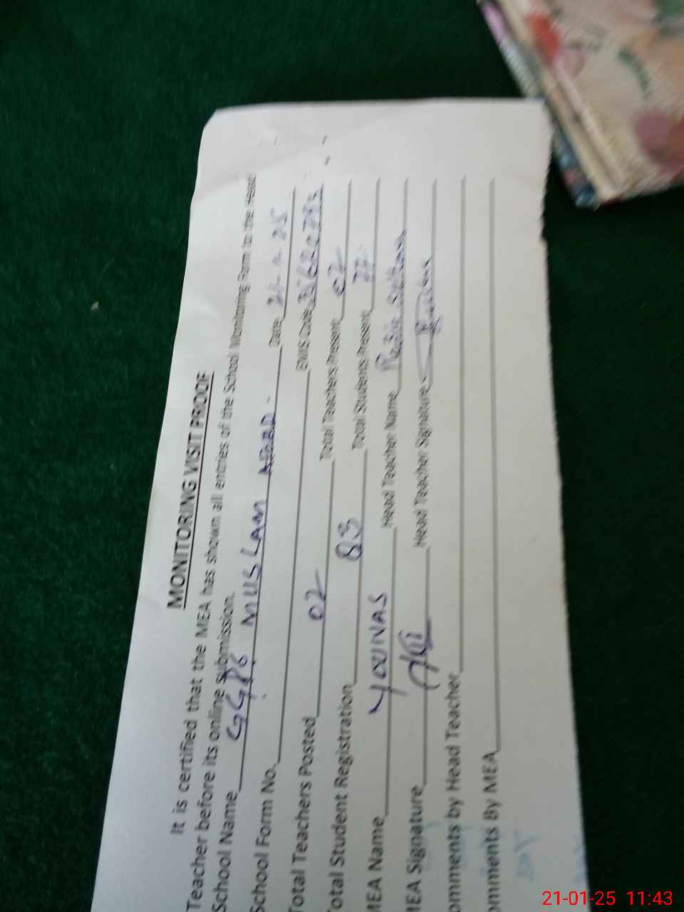 | Attendance Register | Head Teacher | MEA with School | Visit Proof |