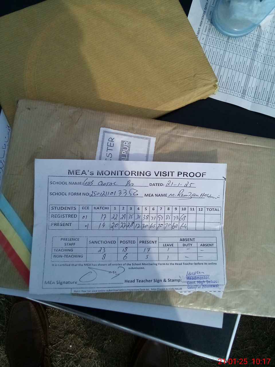 | Attendance Register | Head Teacher | MEA with School | Visit Proof |