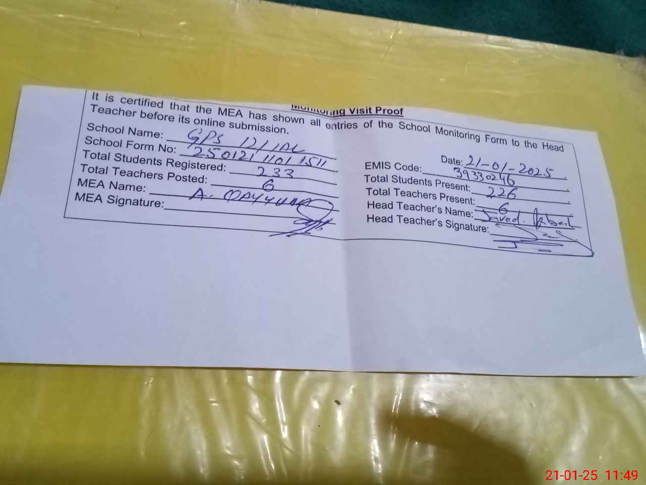 | Attendance Register | Head Teacher | MEA with School | Visit Proof |