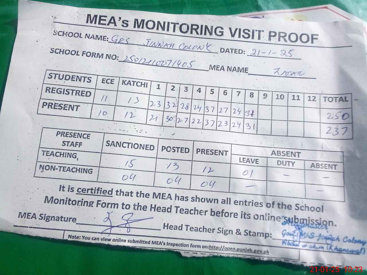 | Attendance Register | Head Teacher | MEA with School | Visit Proof |