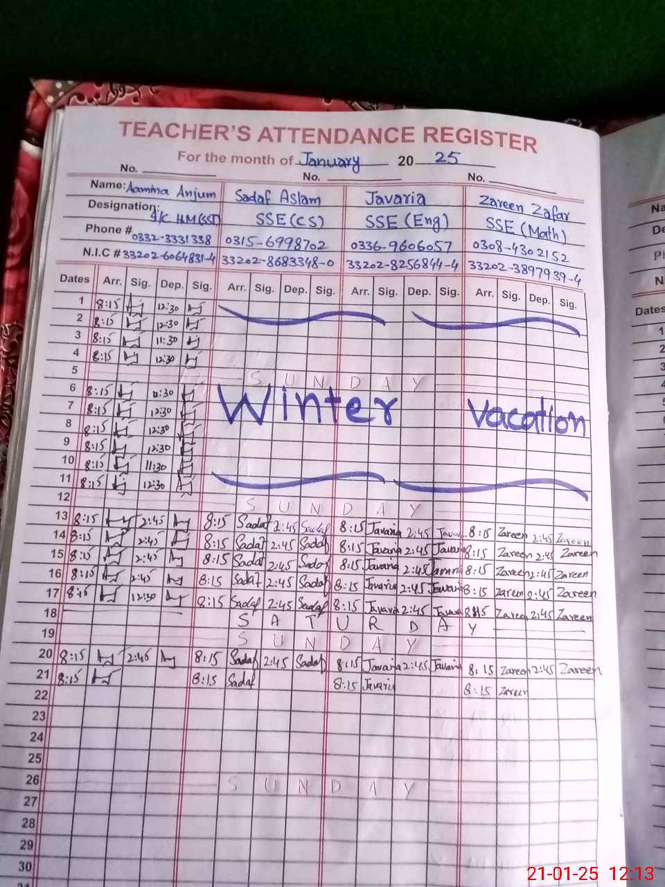 | CNIC | Full Name | Designation | R/C | Absence during last cal. month |