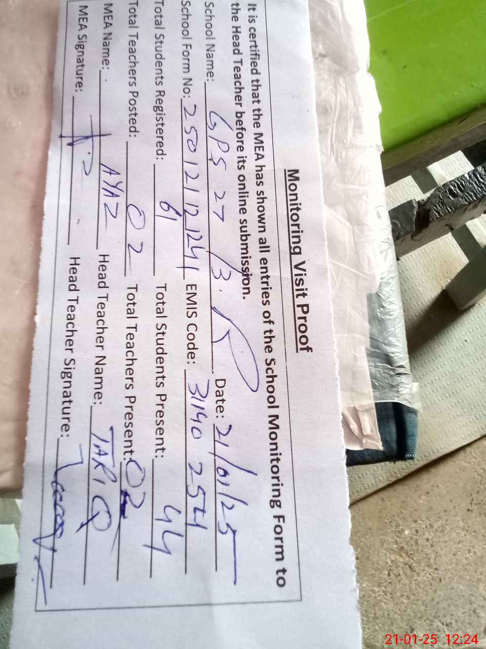 | Attendance Register | Head Teacher | MEA with School | Visit Proof |