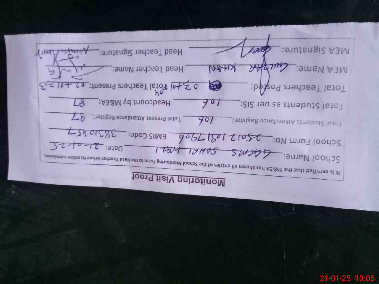| Remarks (Use Separate Page if Required): PST Hafza Mahbeen absent due to leave not approved on SIS and not shown to MEA | |||||