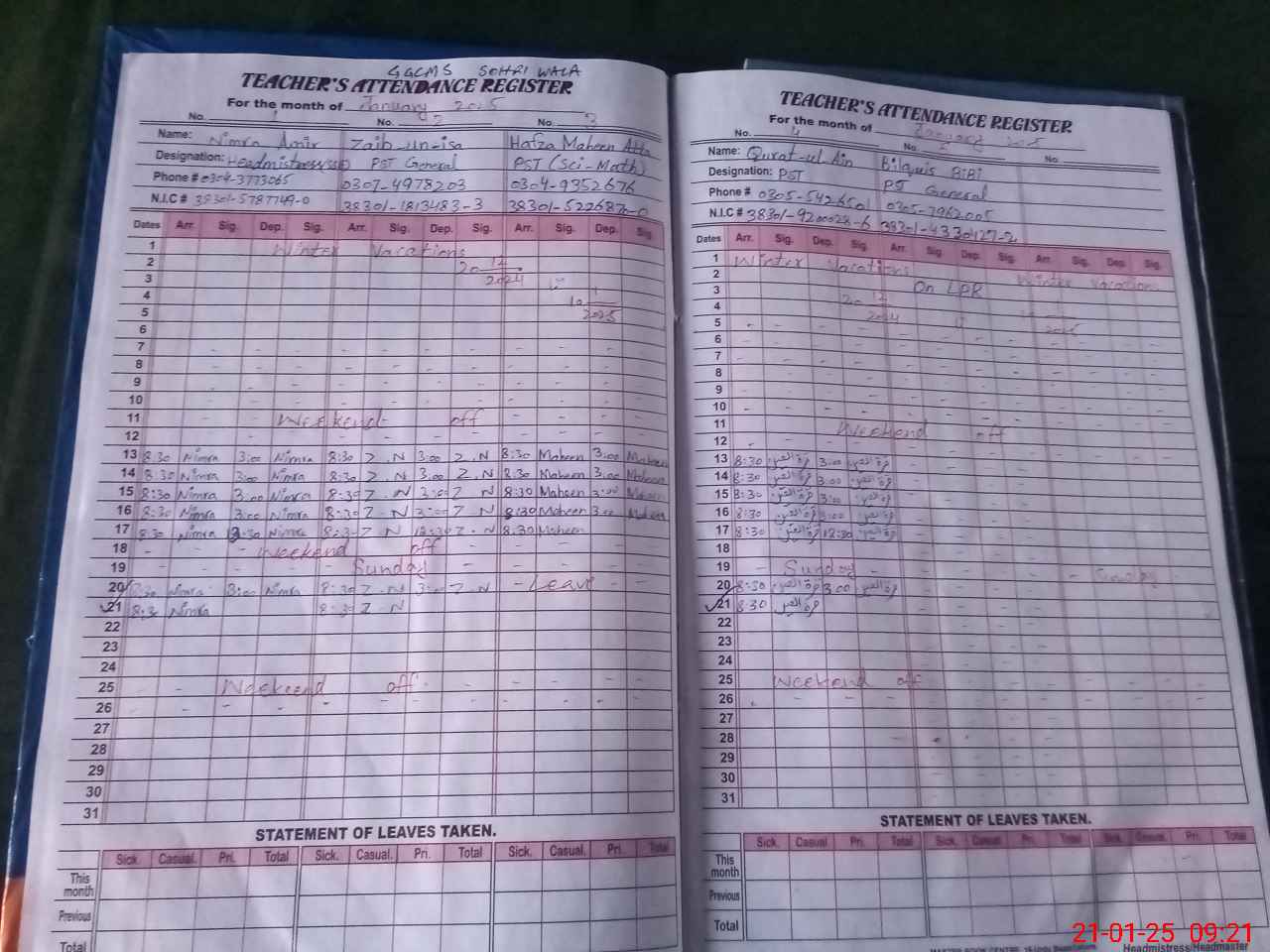 | Total no. of Classrooms: 5 No. of Classrooms Used for Teaching: 5 No. of Classrooms Storing Old Furniture, FTBs, etc: 0Comments if Any: PST Hafza Mahbeen Atta absent due to leave not approved on SIS and not shown to MEA |