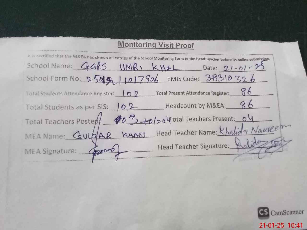 | Attendance Register | Head Teacher | MEA with School | Visit Proof |