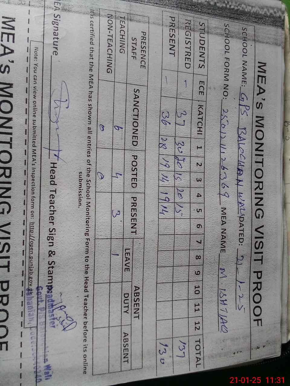 | Attendance Register | Head Teacher | MEA with School | Visit Proof |