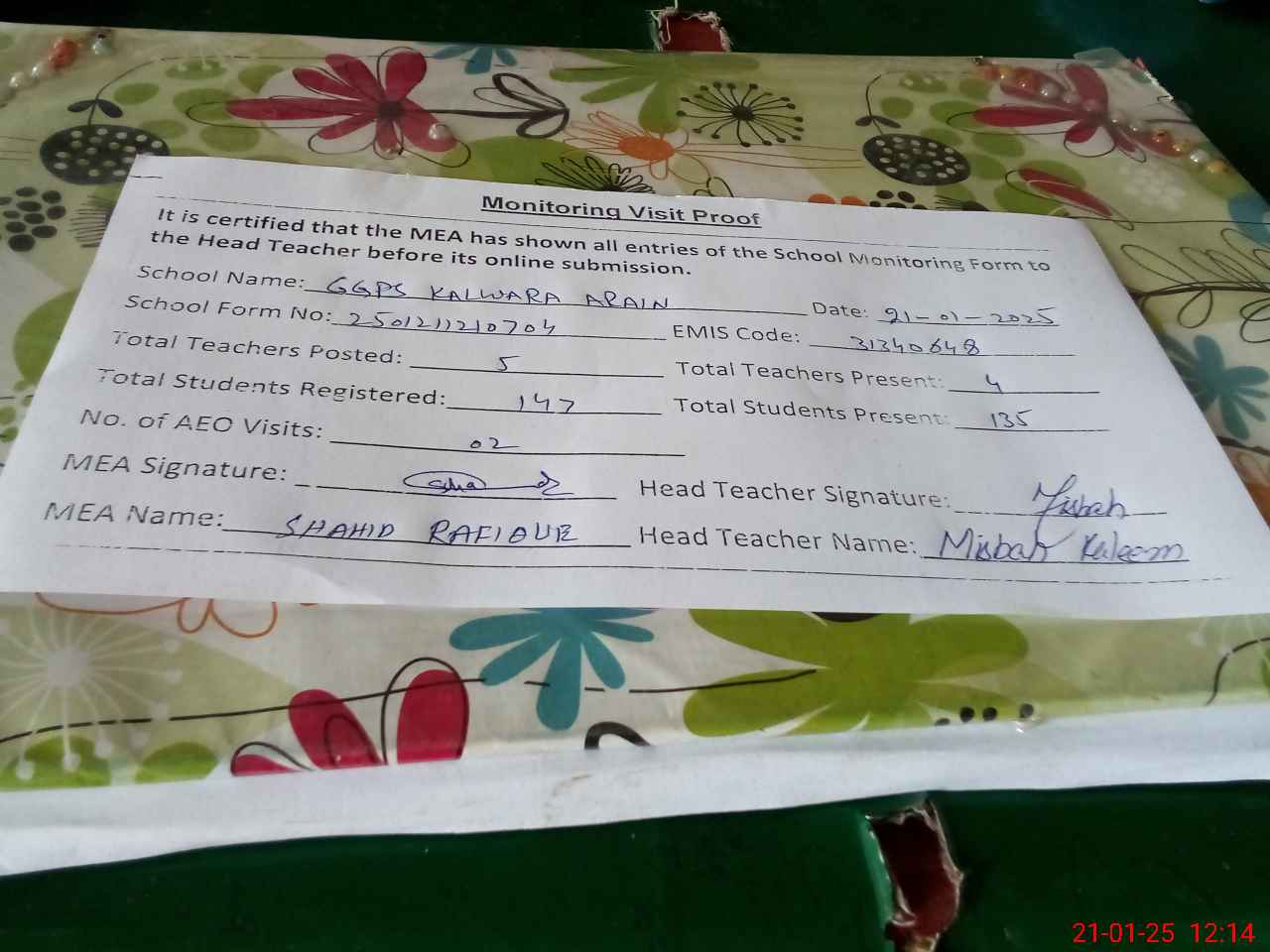 | Attendance Register | Head Teacher | MEA with School | Visit Proof |