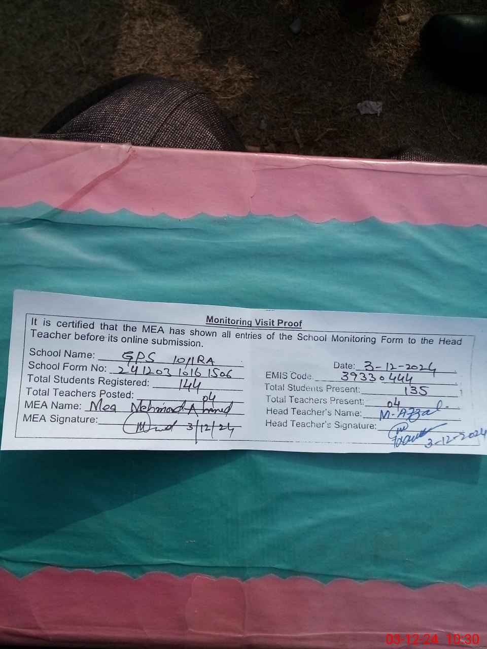 | EMIS Code: 39330444 | Name of School: GPS CHAK NO. 10/1-R | |||