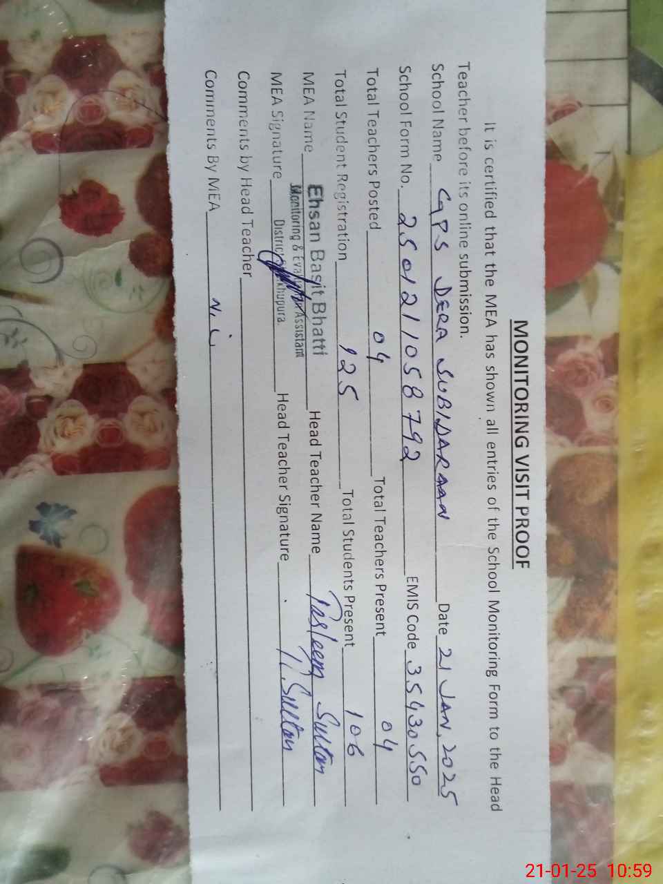 | Attendance Register | Head Teacher | MEA with School | Visit Proof |
