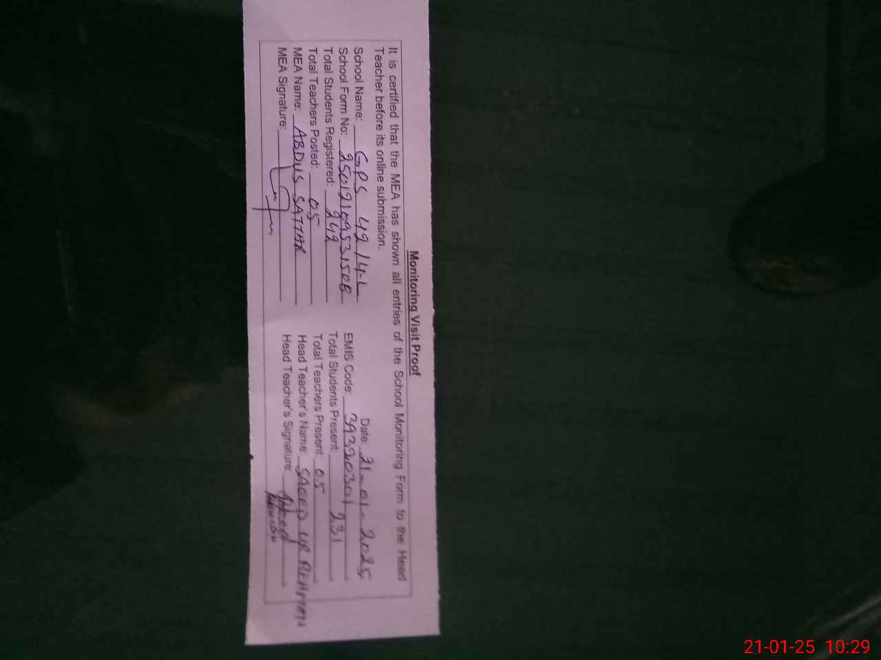 | Attendance Register | Head Teacher | MEA with School | Visit Proof |