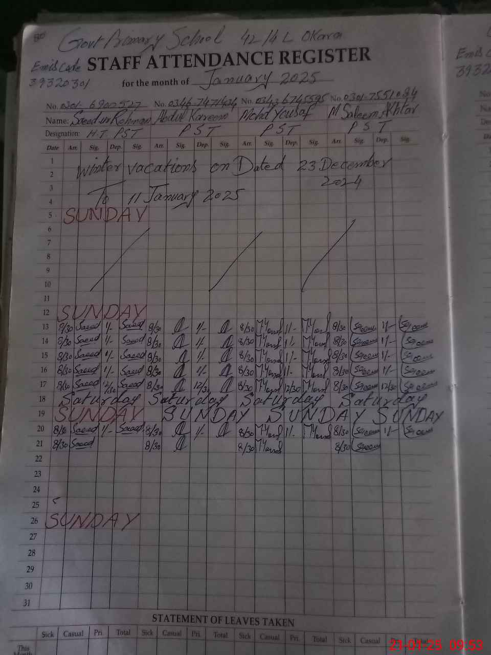 | CNIC | Full Name | Designation | R/C | Absence During Last Calender Month |