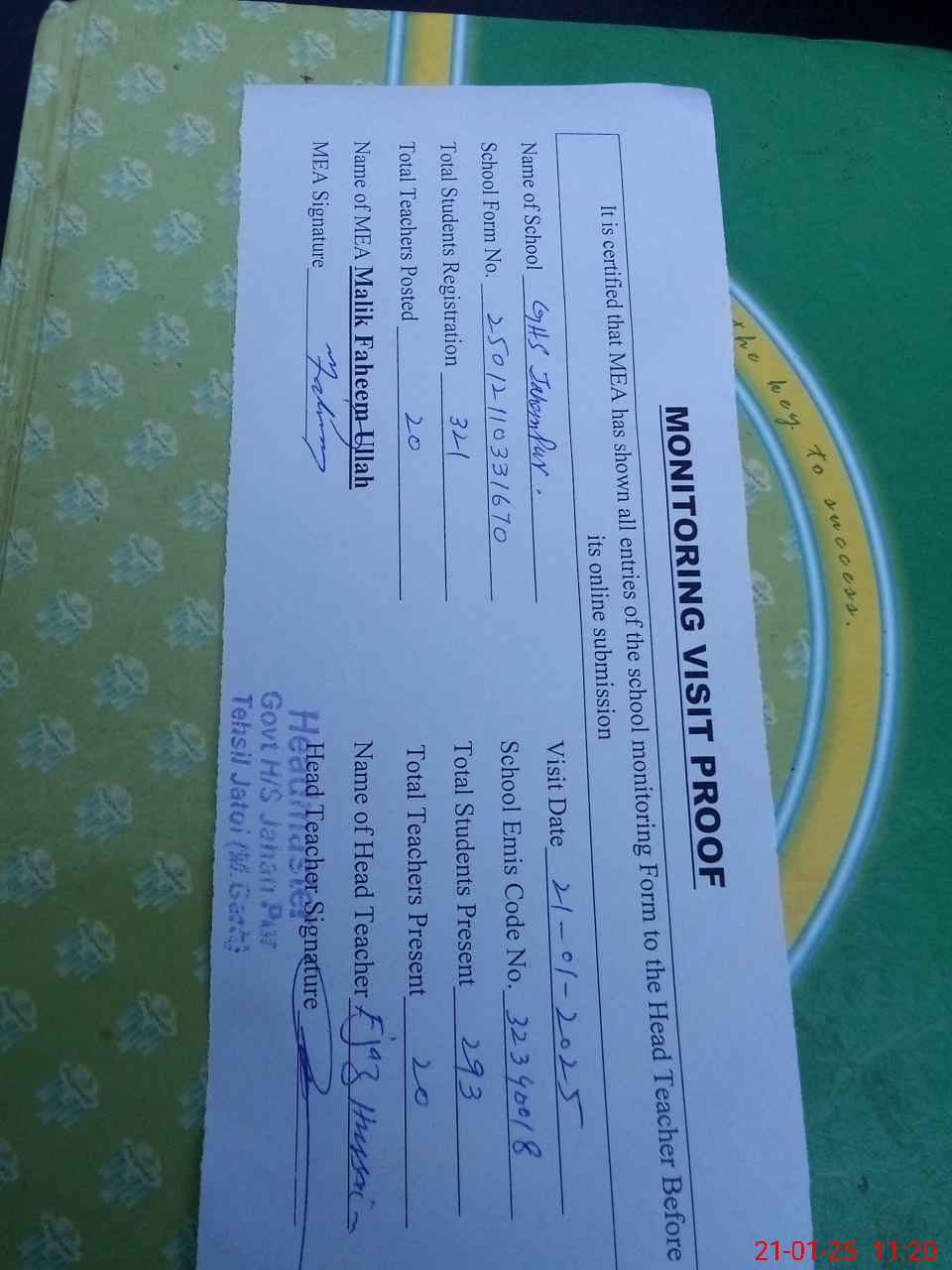 | Attendance Register | Head Teacher | MEA with School | Visit Proof |