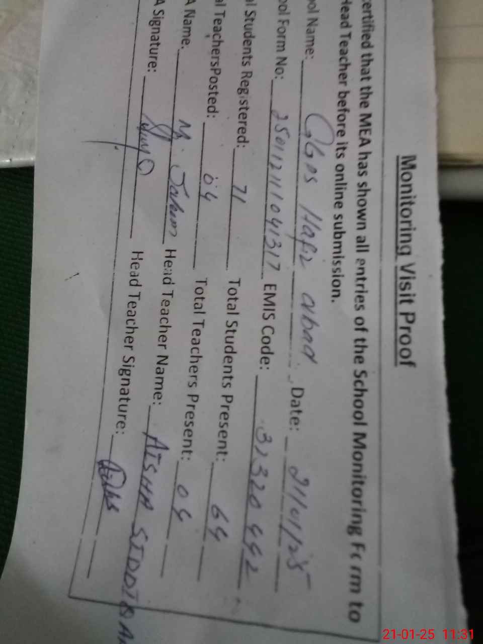 | Attendance Register | Head Teacher | MEA with School | Visit Proof |